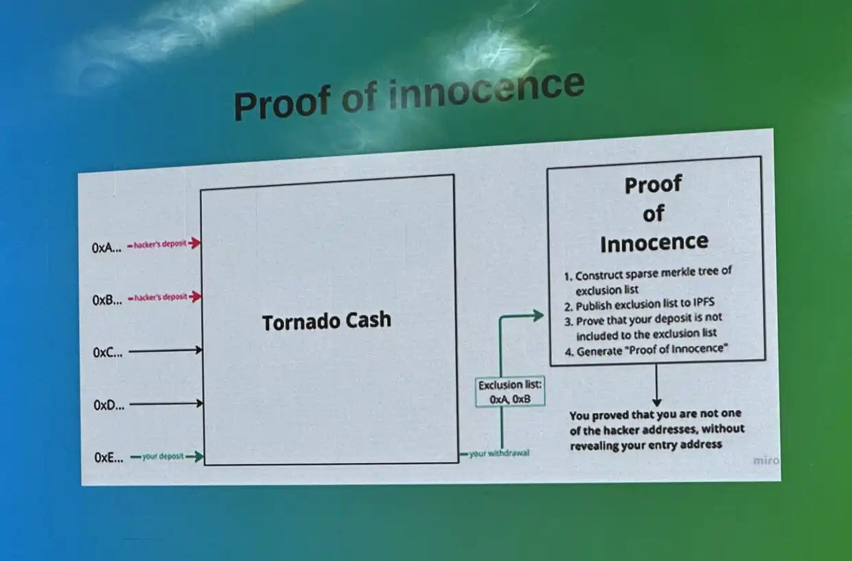 当然,还可以像 V 神演讲中所指的那样,直接构建 exclusion list 默克尔树,相当于给 Tornado 协议加入了一个黑名单机制。 正常用户的入金不在 list 之内就可以生成无辜证明进而正常使用 Tornado,反之则恰恰相反。 加黑名单虽然有效,但有中心化风险,个人认为阻挠出入金私钥不一致的交易更有意义一些。
